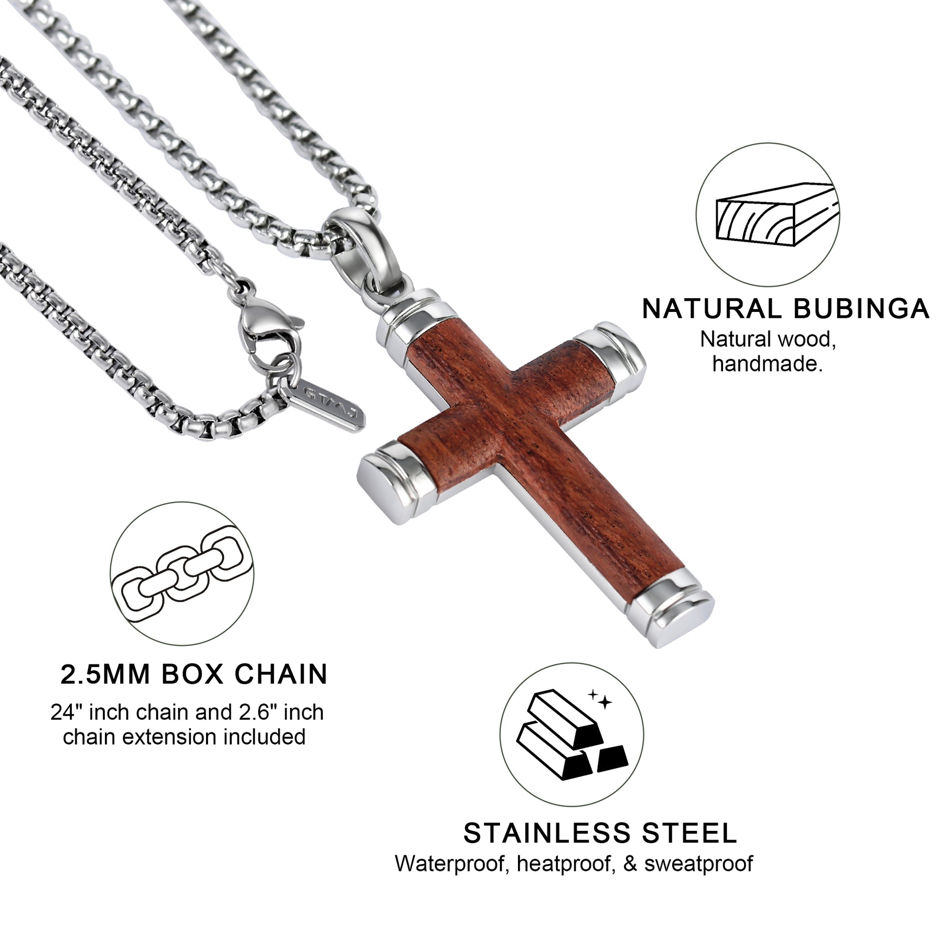 GTMJ Men's Cross Pendant Necklace Set - 316L Stainless Steel & Natural Wood, 24"+2" & 20"+2" Adjustable Box Chains, Luxury Gift Box (Ebony/Bubinga/Gold&Steel)